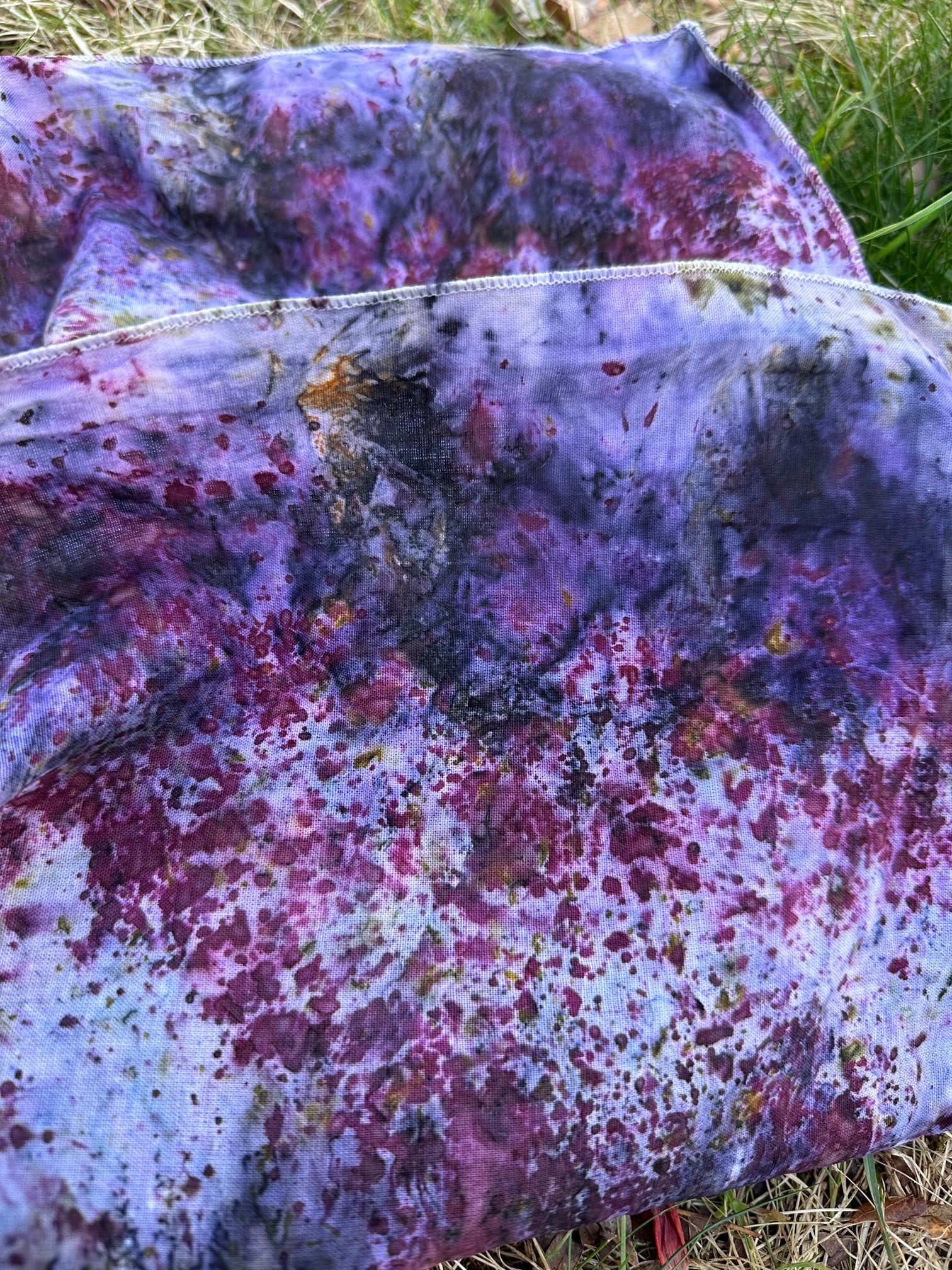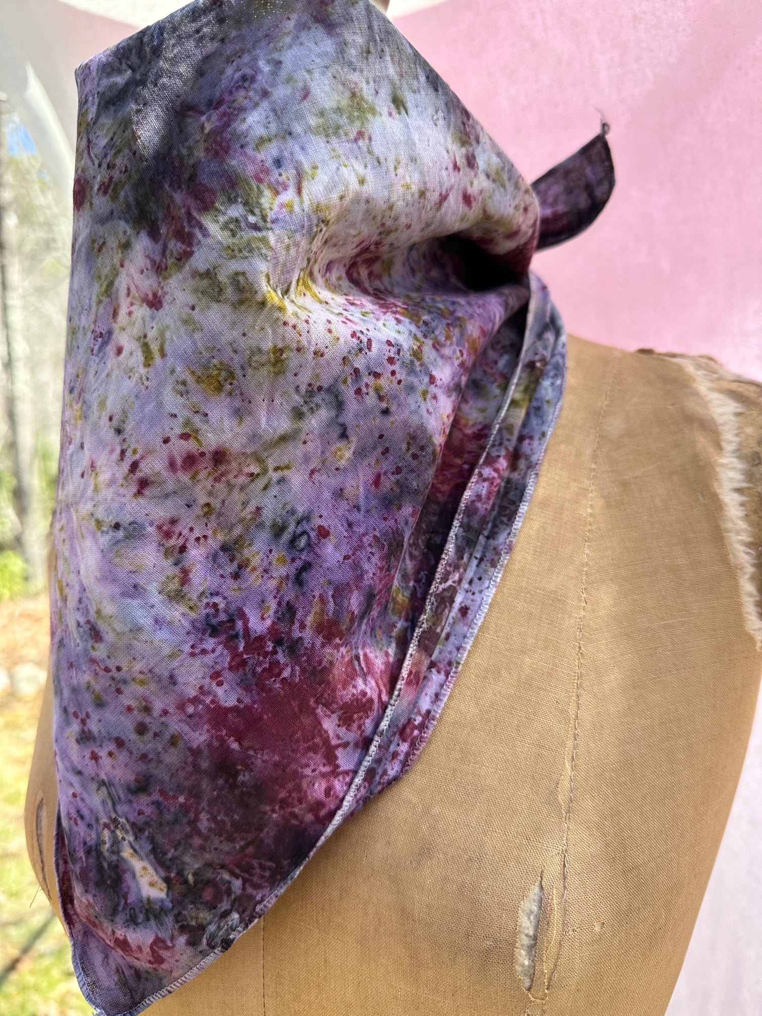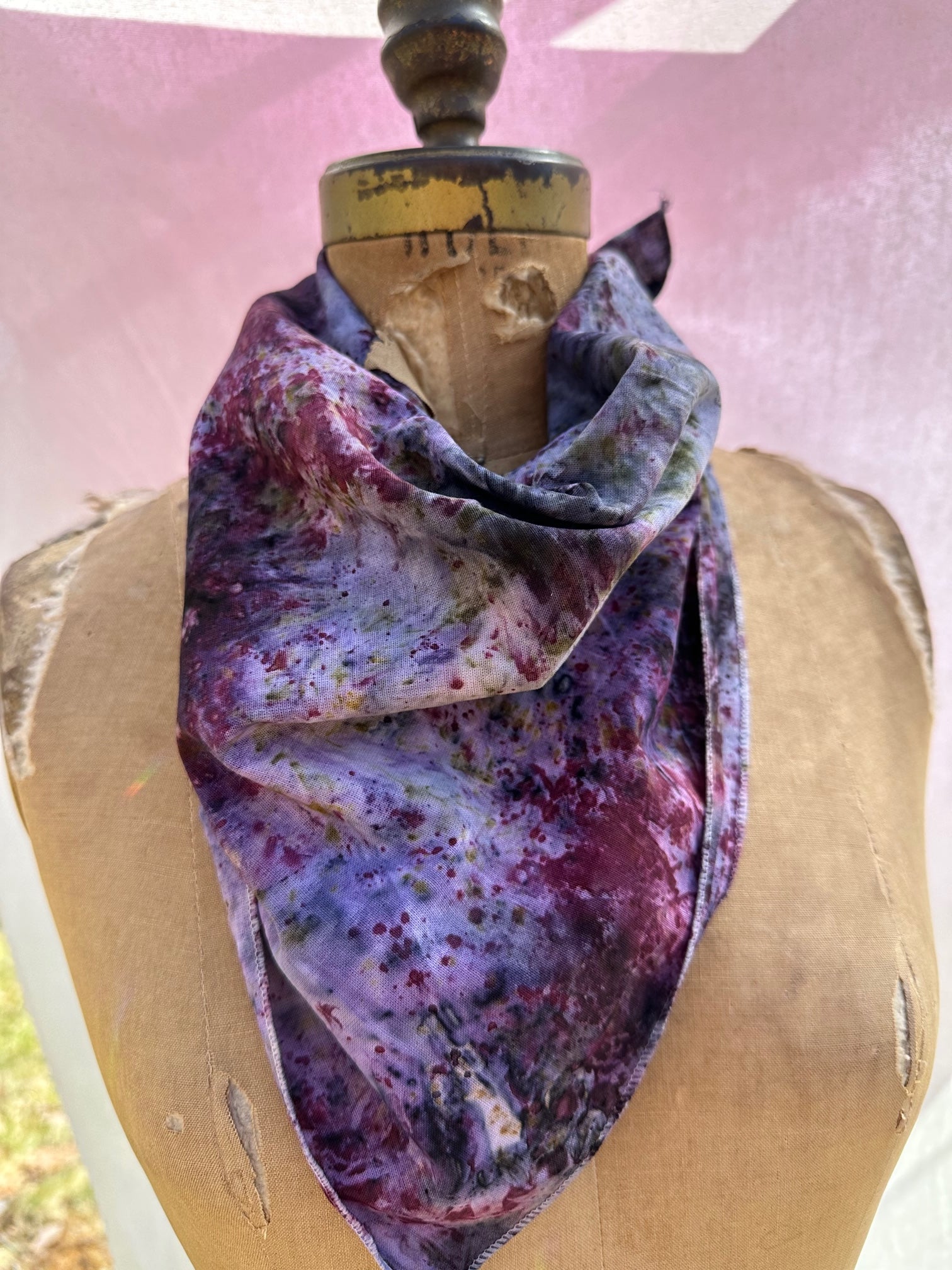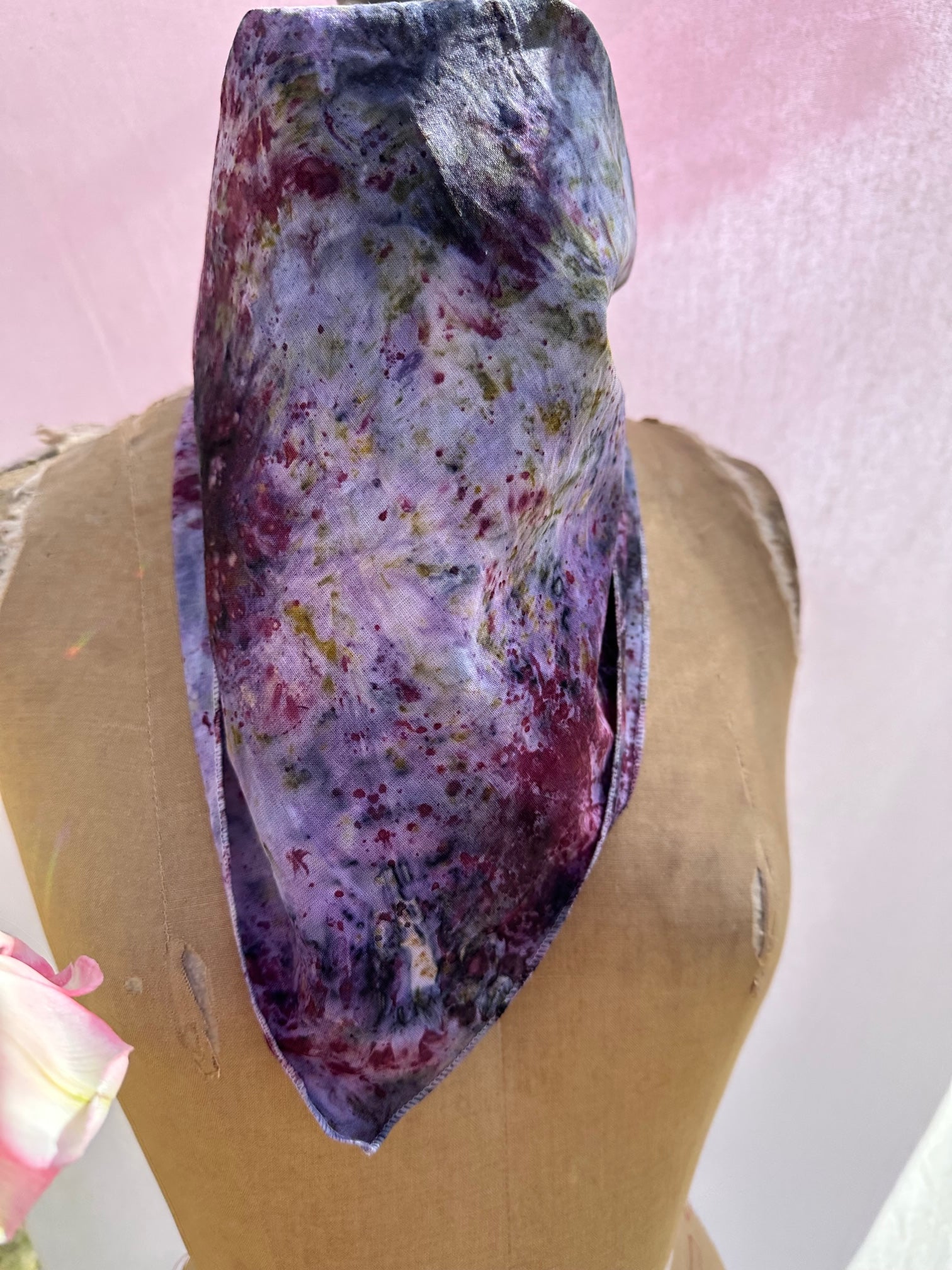 Cotton bandana / Altar Cloth /Head Wrap. Hand dyed in-between the worlds with love, intention, and plant magic! Feel the plant spirits of Rose, Dahlia, Delphinium, Blue Pea, Blue Lotus, Logwood, Lac, and Iron.