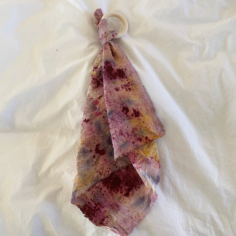 This one of a kind set was hand dyed with plant magic in-between the worlds with love and intention. Cotton long sleeve coverall that snaps along the legs with a raw silk bandana that doubles as a play silk when mama isn't wearing it with a wooden sensory piece.