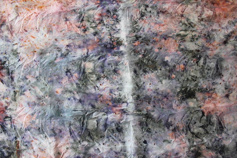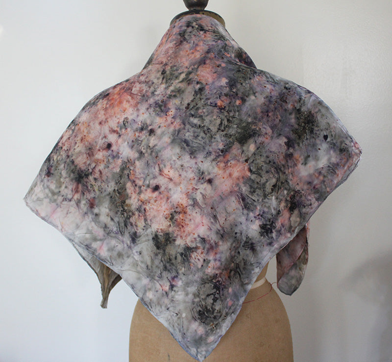One of a kind hand dyed silk shawl infused with the plant spirits of Rose, Hibiscus, Mugwort, Butterfly Bush, Cochineal, Iron, and Citrus