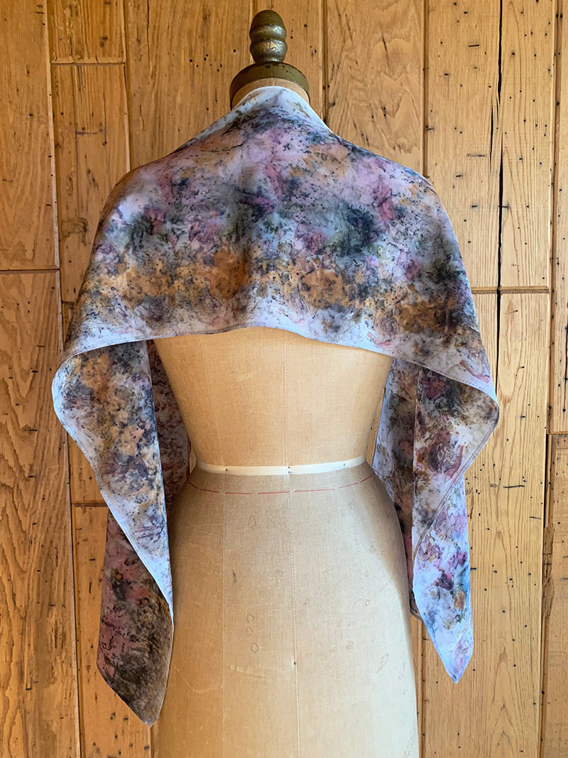 When I sat with this piece I received a message of slowing down for a shedding of old the old self. This Silk light weight scarf with beautiful shades of Pink, Green, Purple, Orange and Tan. Bring the power of the plants everywhere you go, this piece wears wells for dressing up or with jeans. Wrap around yourself as a mediation scarf or work with in ceremony. The options are endless for these one of a kind pieces.