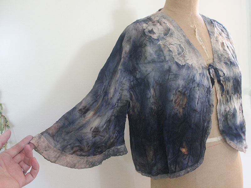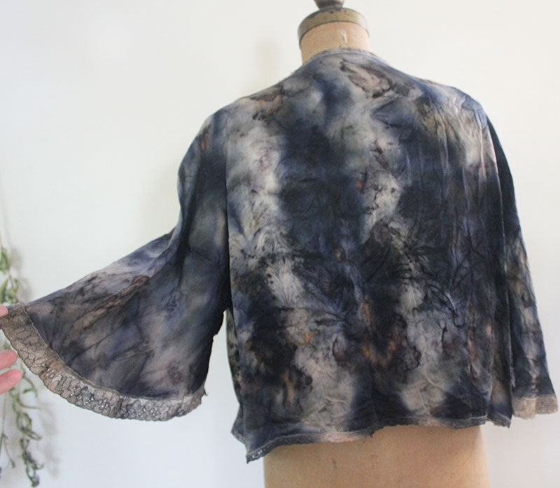 Wearable medicine, wearable art! This gorgeous piece was infused with the plant spirits of Rose, Coleus, Indigo, Turmeric, Calendula, and Iron. Upcycled 1940's silk piece that looks wonderful over a dress or with jeans. Fits size S-L, best for M/L (16" laying flat shoulder to shoulder). One of a kind!!!