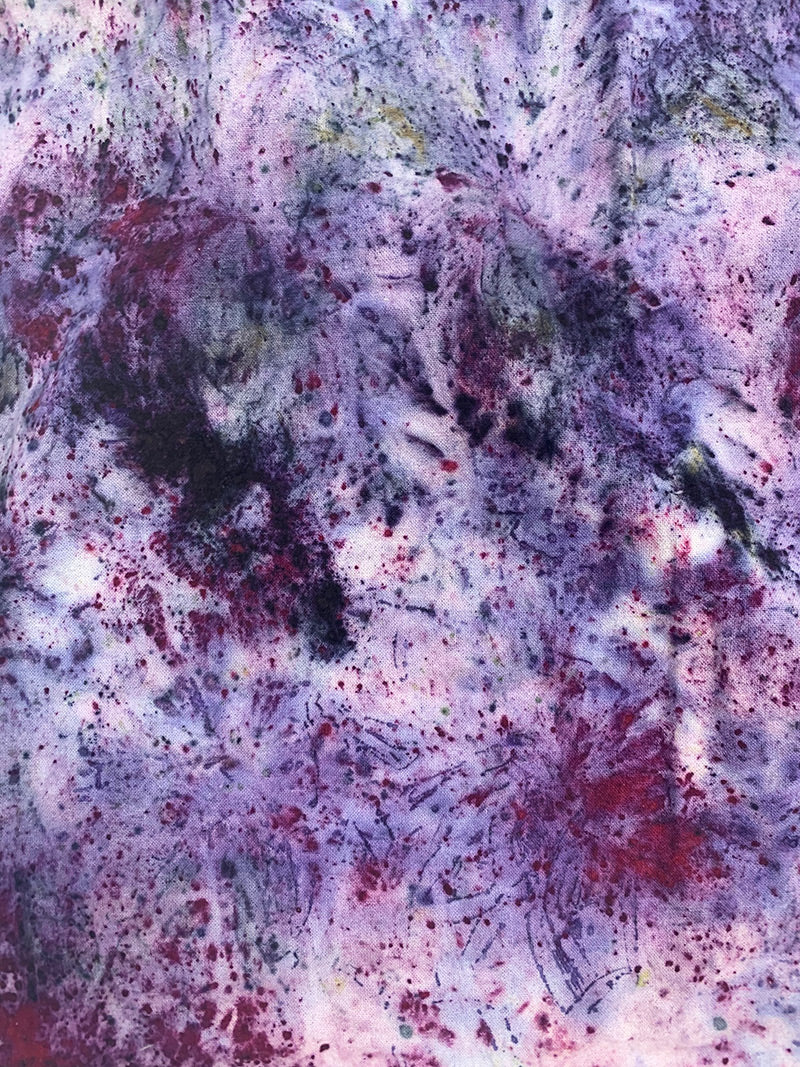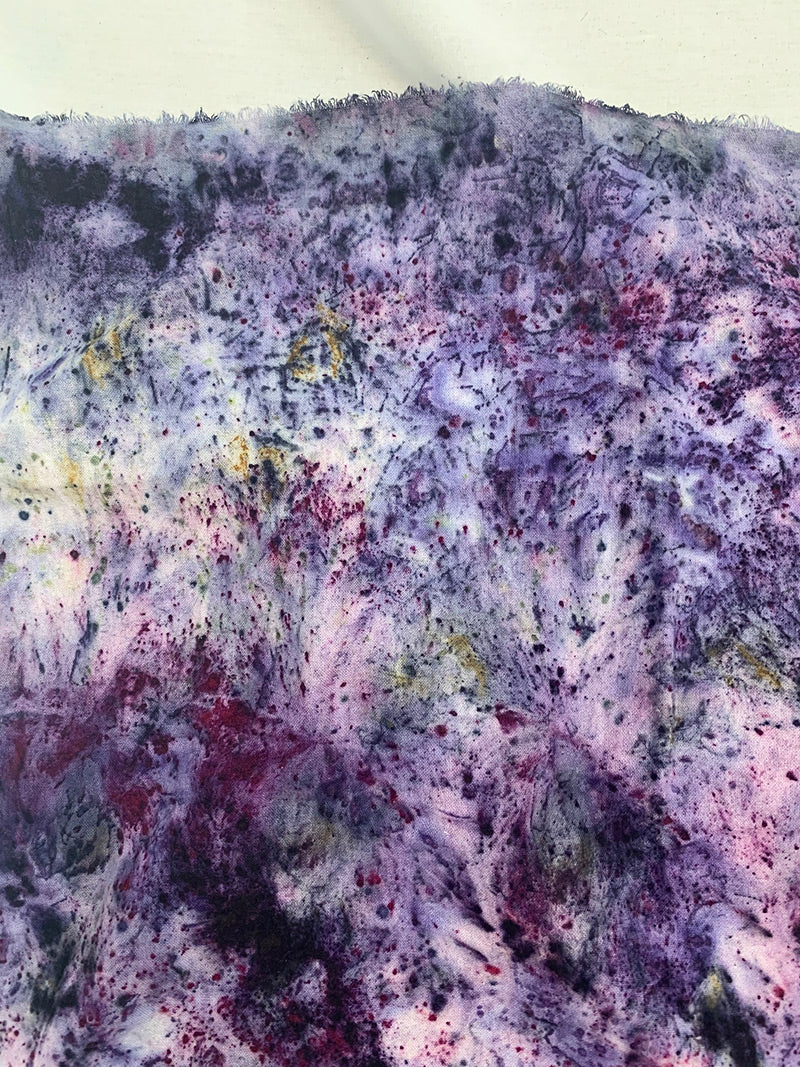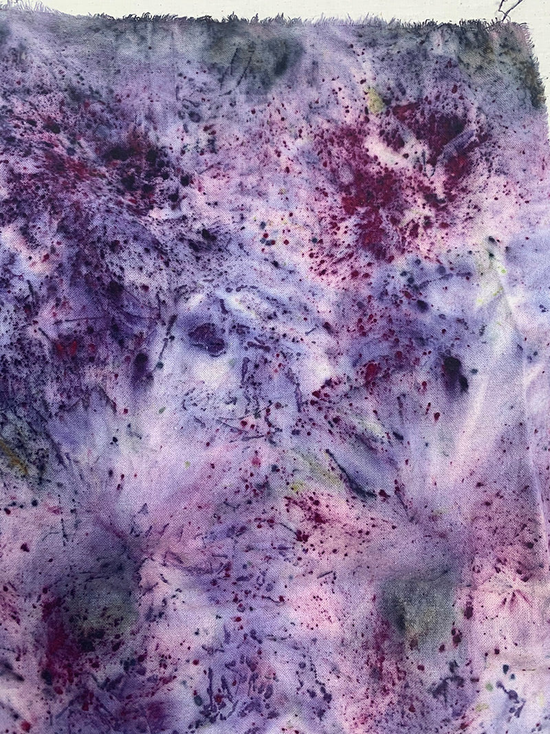 This beautiful raw silk piece with raw edges is part of a throat chakra medicine series that has been anointed with bay laurel to release blockages and to let your voice be heard. Find inspiring shades of violet, red, and blue. Bring the power of the plants everywhere you go, this piece wears well wrapped around the neck, as a face cover, and works well as an altar cloth.
