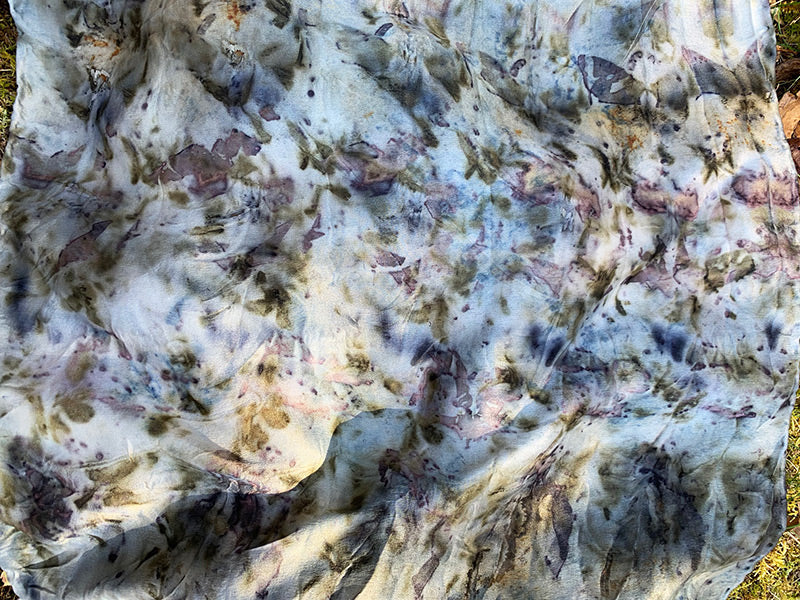 Find inspiring shades of blue, hints of green, pink, and purple. Bring the power of the plants everywhere you go, this piece wears wells as a bandana, tightly wrapped necklace, tied around wrist, worn as face cover, tied on a bag, an altar cloth and to hold tarot cards.