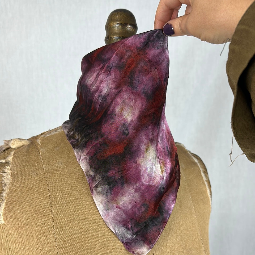 Silk bandana/ altar cloth hand dyed in between the worlds with love, intention, and plant magic. Feel the plant spirits of rose, lac, dahlia, oak, and iron.