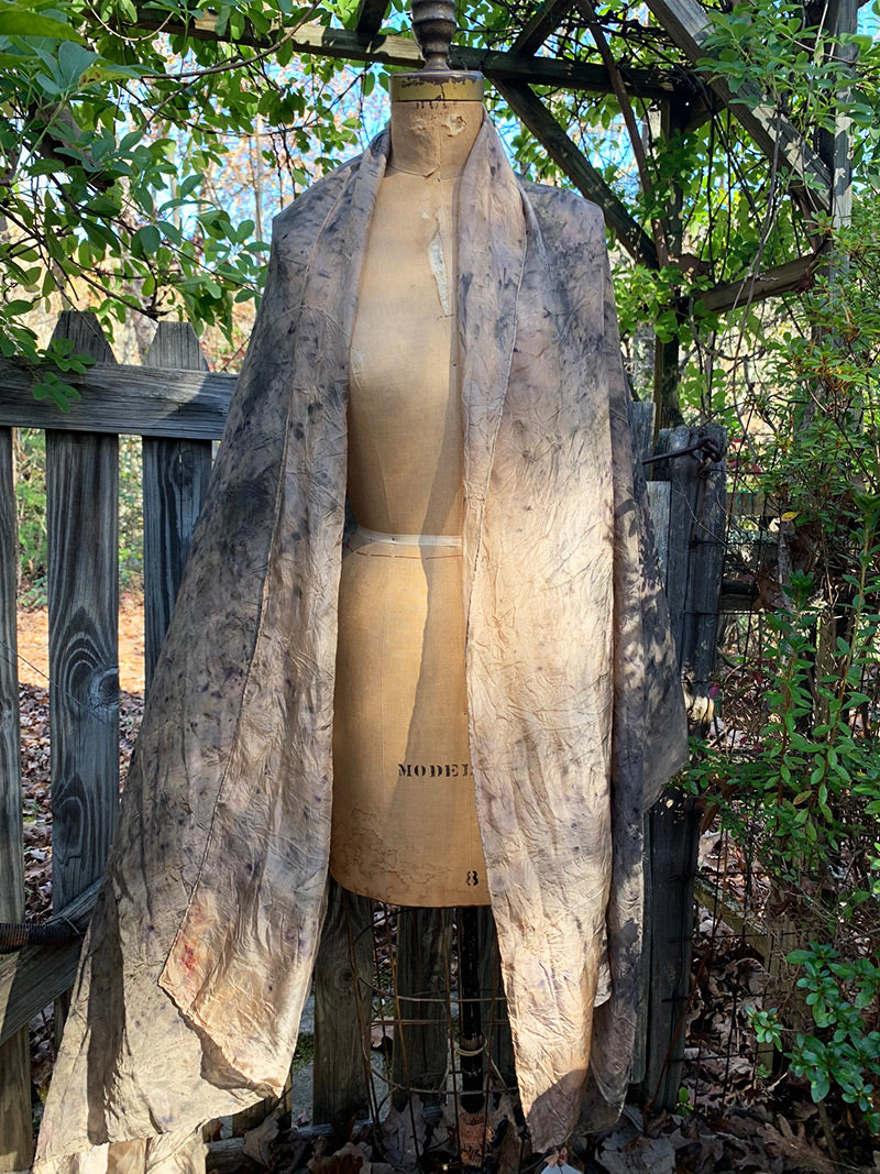 This tissue soft silk large shawl sings of a crisp winter sunset of mauves, violest, and greys . Find inspiring shades of dusty rose, soft violet, grey and splashes of green. Bring the power of the plants everywhere you go, this piece wears well for dressing up or with jeans. Wrap around yourself as a mediation scarf or work with in ceremony. The options are endless for these one of a kind pieces.