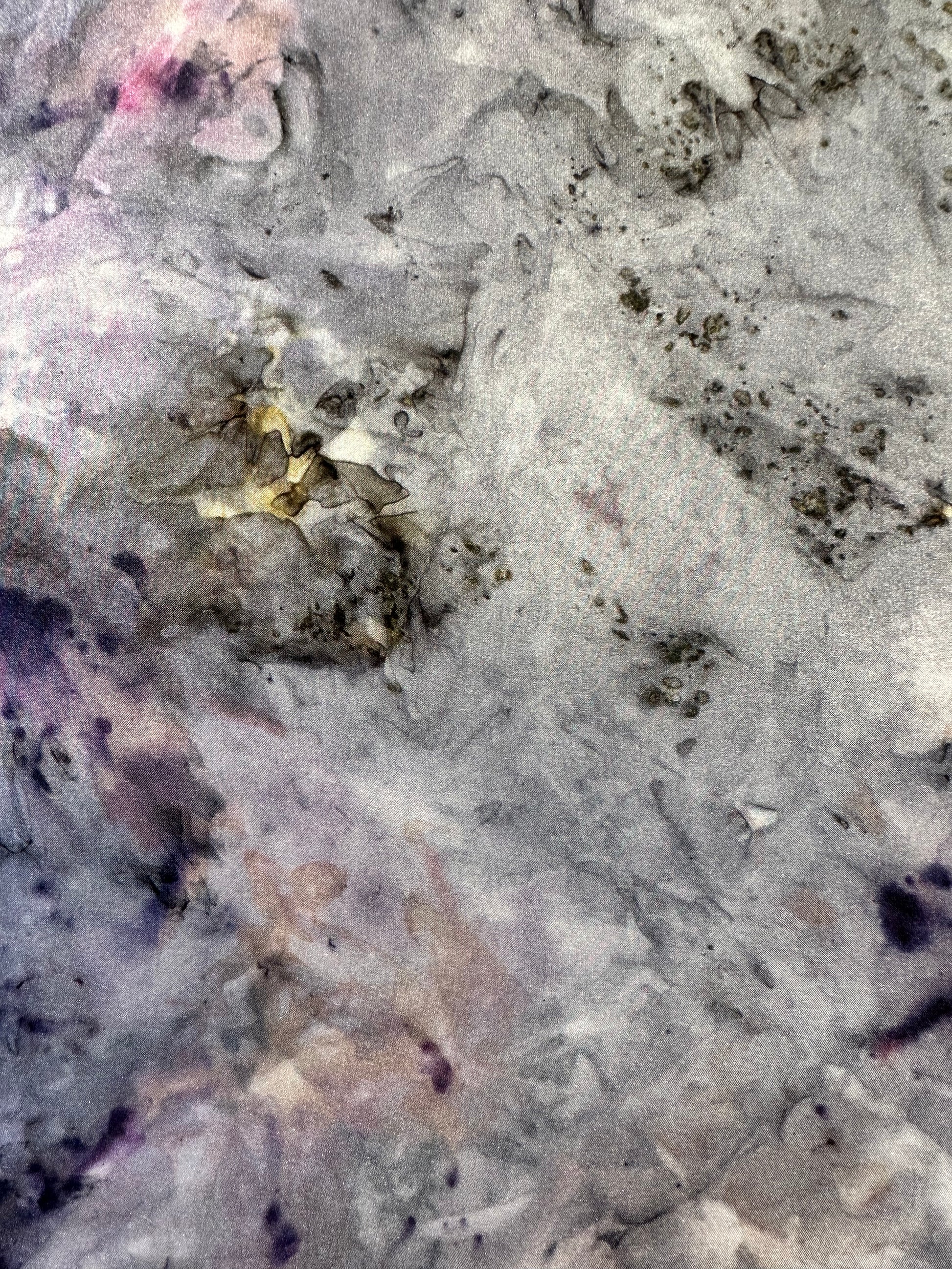Yarrow, mugwort, blue lotus, blue pea, rose, acorn, cochineal, dahlia, and iron on silk