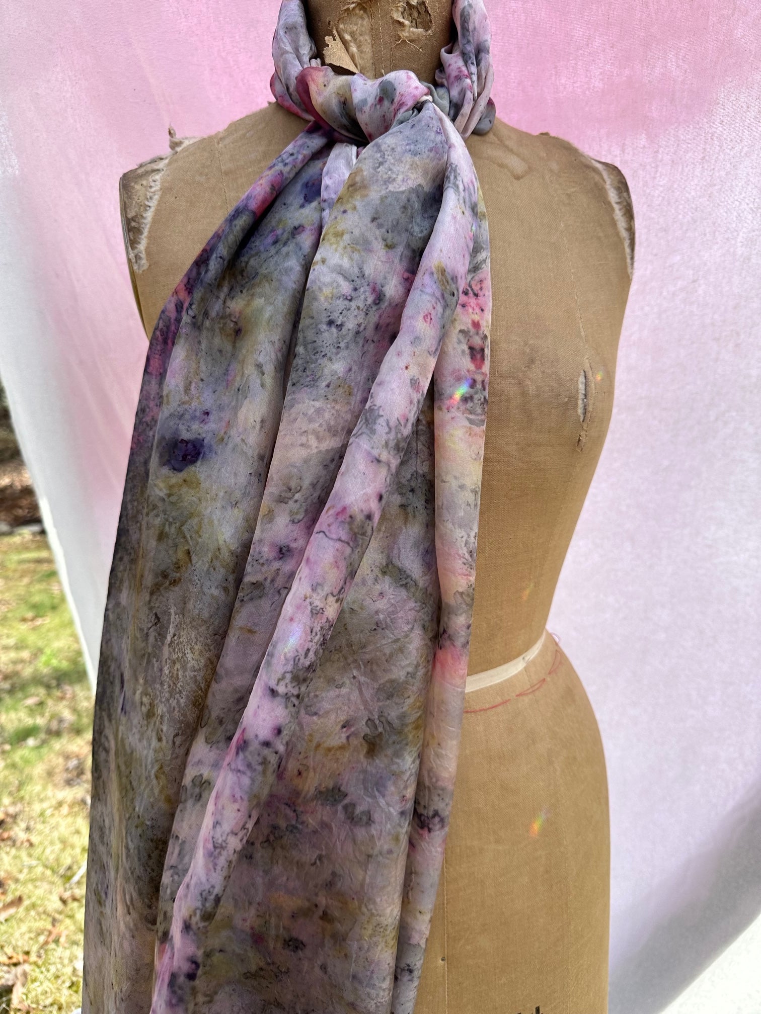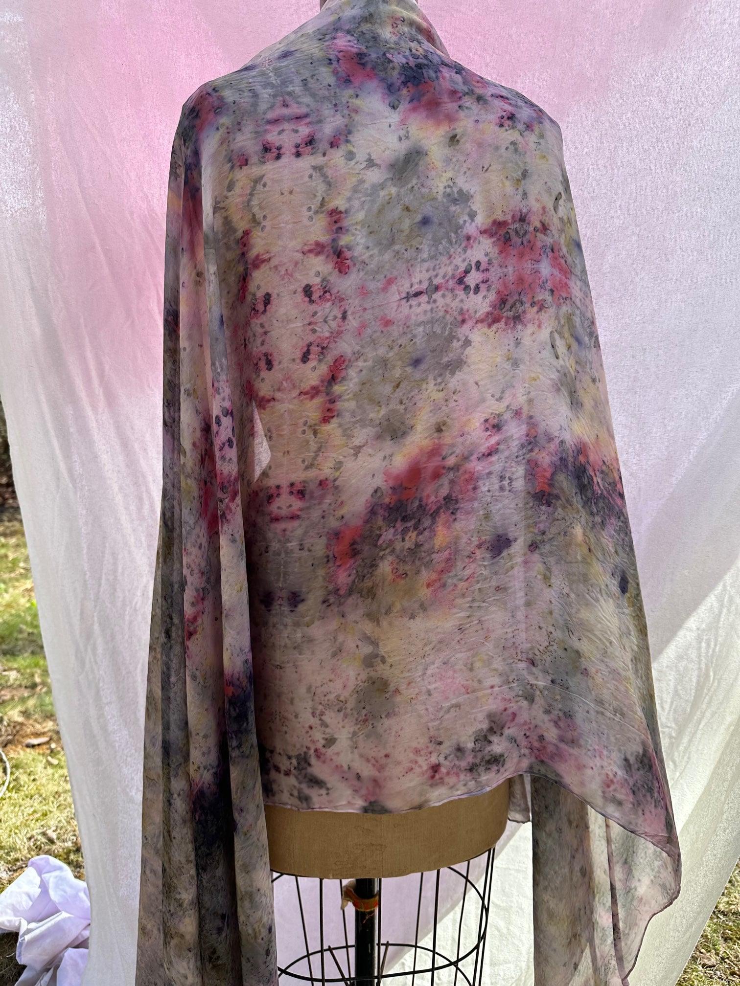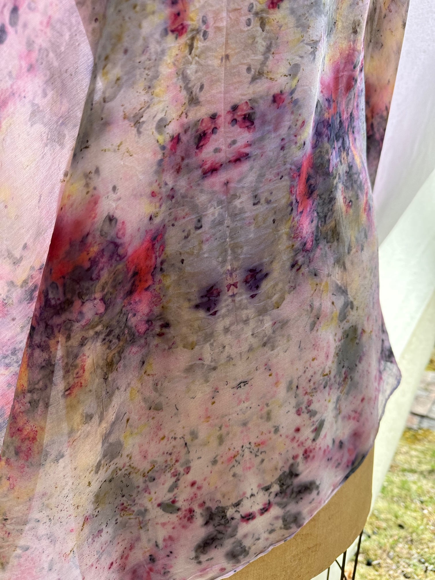 Hand dyed in-between the worlds with love, intention, and plant magic. Feel the plant spirits of Rose, Delphinium, Dahlia, Marigold, Motherwort, cochineal, copper, and iron.